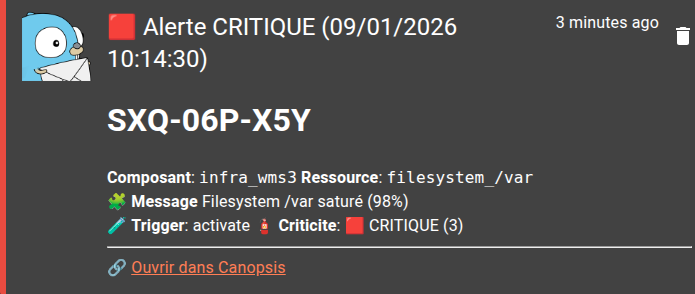 Lorsqu’un filesystem passe au-delà d’un seuil critique ou qu’une machine ne répond plus, Canopsis déclenche le scénario et envoie immédiatement une notification Gotify à la personne d’astreinte.