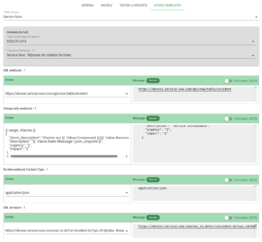 On créé alors une règle de déclaration de ticket dans Canopsis. Dans l’onglet Studio Templates, on exécute le test en sélectionnant au préalable la réponse Service Now. On découvre ainsi toutes les valorisations de variables présentes dans notre template : URL, Payload, gestion du ticket…